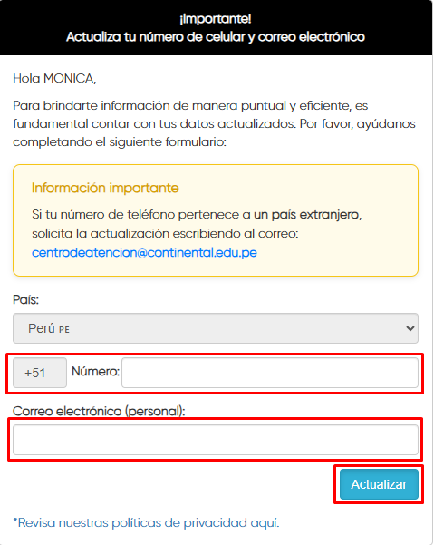 - Una vez dentro del formulario, deberás actualizar tu número de celular y tu correo electrónico personal.