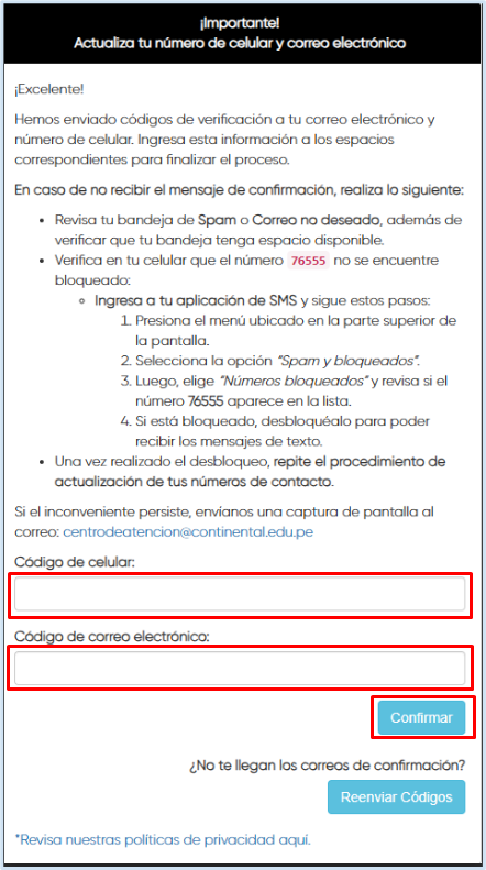 Una vez obtenido el código de verificación, ingrésalo en el campo correspondiente del formulario de actualización de datos de contacto.