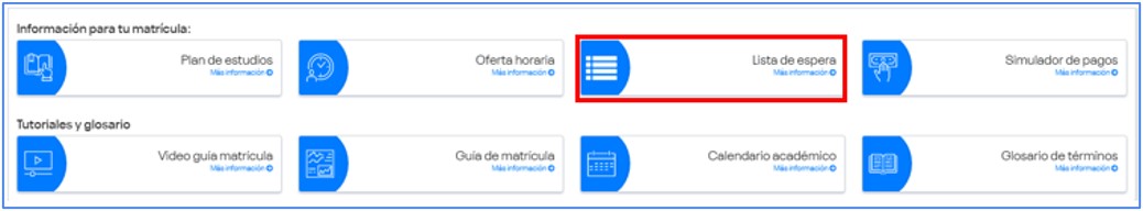 - Visualizarás los 3 pasos de la matrícula y en la parte inferior encontrarás la opción “Lista de espera”.