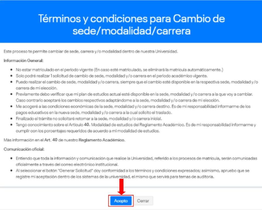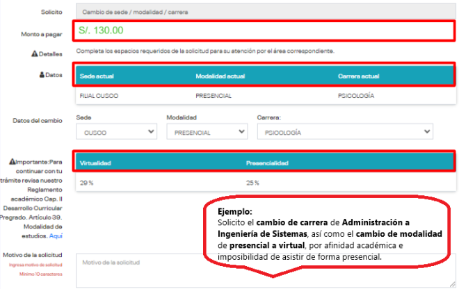 - Selecciona la opción “Cambio de sede/modalidad/carrera”.