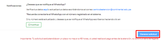 Si en 72 horas de haberse generado la deuda, no realizas el pago respectivo, se cancela la solicitud y la deuda.