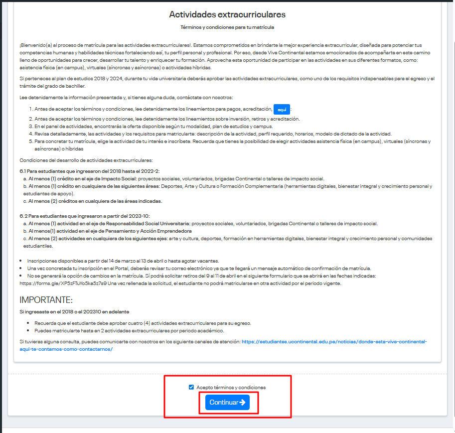 - Después de culminar todo el proceso de matrícula a las actividades extracurriculares, el estudiante tendrá un tiempo de 48 horas para tramitar el retiro de una actividad extracurricular. Las fechas se indican en los Términos y Condiciones.