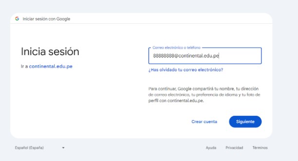 Escriba o seleccione su correo institucional: XXXXXXXX@continental.edu.pe (NO USE SU CORREO PERSONAL).