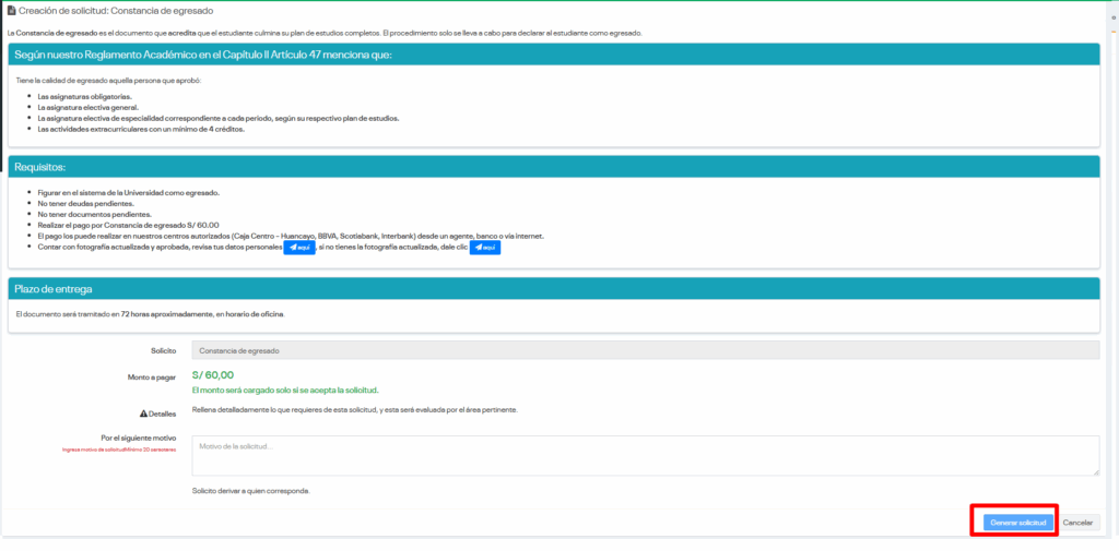 - Realizar el pago por Constancia de egresado S/ 60.00