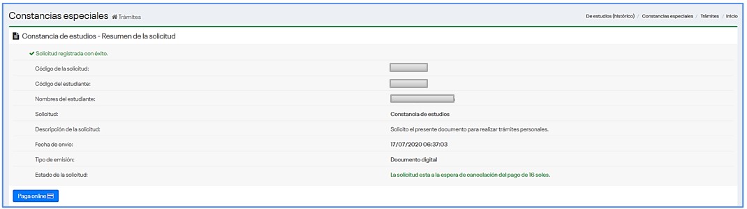 - Realizar el pago por constancia de estudios histórico y derecho de trámite: S/ 30.00 y S/ 1.00, respectivamente.