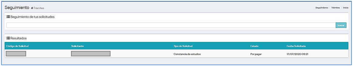 - Podrás realizar el seguimiento de tu solicitud, ingresando a la opción “Trámites”, sección “Seguimiento”. En este espacio visualizarás una lista de las solicitudes tramitadas para su respectivo seguimiento.