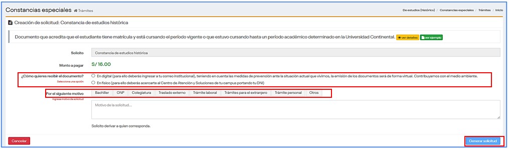 Rellena la solicitud con el motivo del trámite, elegir cómo quiere recibir el documento y clic en “Generar solicitud”.