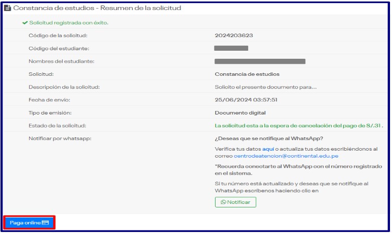 Una vez generado la solicitud, podrás visualizar el resumen del mismo y el monto a efectuar.