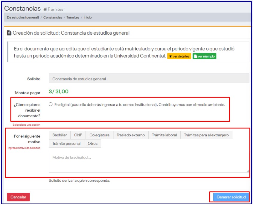 - Rellena la solicitud con el motivo del trámite y haz clic en “Generar solicitud”.