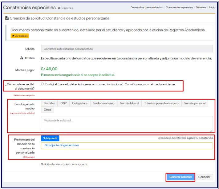 Rellena la solicitud con el motivo del trámite, elige cómo quieres recibir el documento, adjunta un ejemplo y/o modelo de tu constancia personalizada y haz clic en “Generar solicitud”.