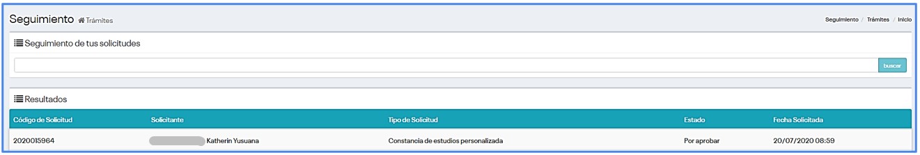 - Podrás realizar el seguimiento de tu solicitud, ingresando a la opción “Trámites”, sección “Seguimiento”. En este espacio visualizarás una lista de las solicitudes tramitadas para su respectivo seguimiento.