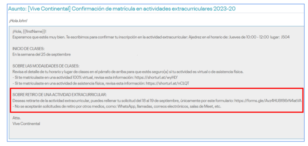 Una vez que el estudiante se matricula en una actividad extracurricular desde el Portal del Estudiante, de inmediato recibe un correo de confirmación con los lineamientos para el inicio de clases, así como, información sobre el trámite de retiro. Por lo tanto, si no desea llevar una actividad extracurricular, tiene la opción de retirarse a través del formulario y en 48 horas, recibe un correo de confirmación de que se procedió con lo solicitado.