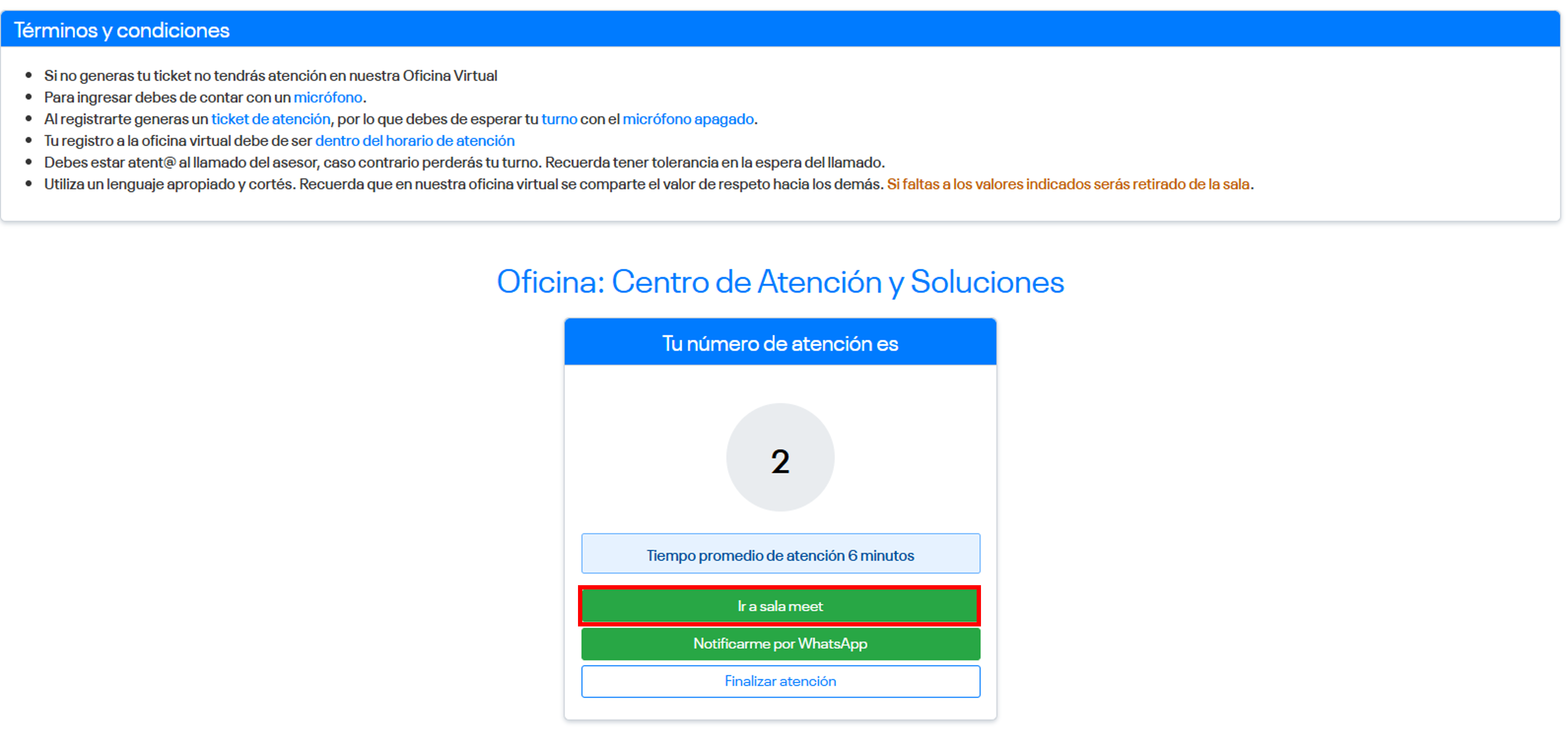 Visualizarás el número de tu Ticket de atención y puedes “Ir a sala meet” de tu tema escogido.