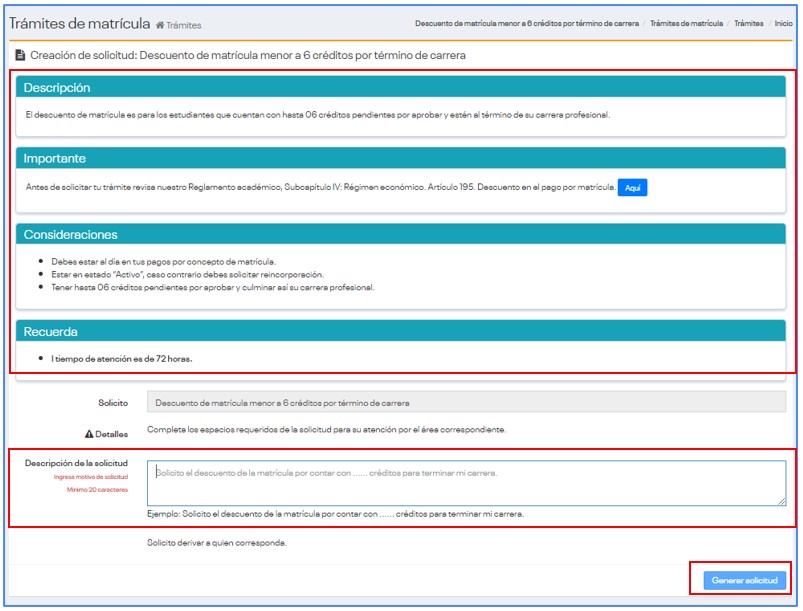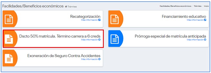 Ingresa al trámite “Dscto 50% matrícula. Término carrera a 6 creds”.