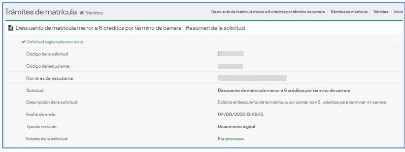- Una vez generado la solicitud, podrás visualizar el resumen de este.