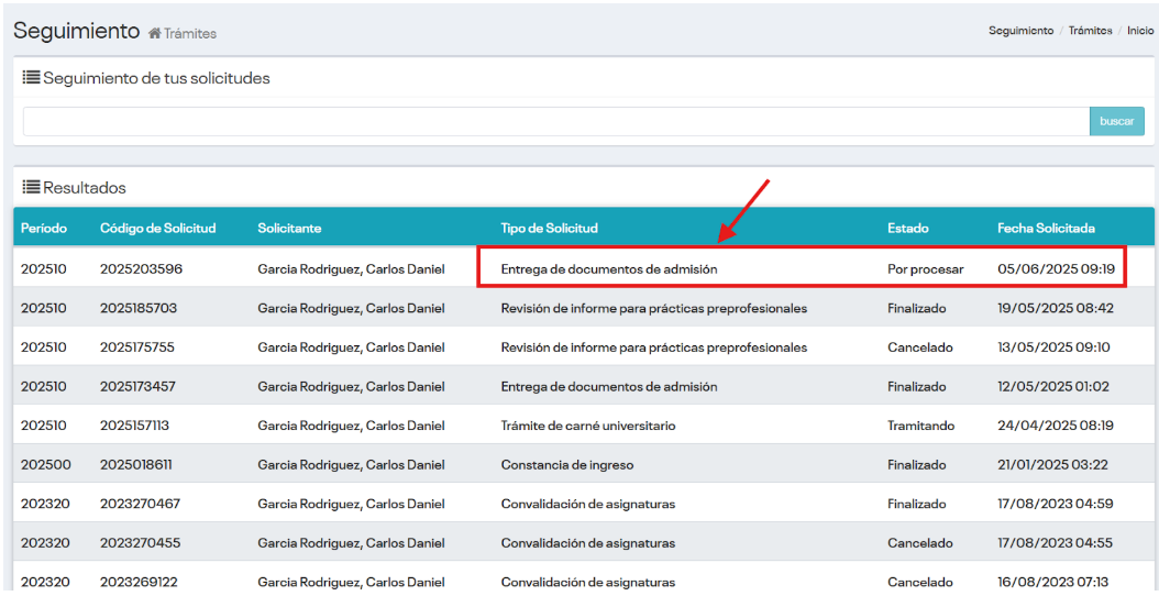 - Ingresa al trámite “Entrega de documentos de admisión”, valida los documentos enviados y el “Estado” de tu trámite: “Por procesar” o “Finalizado”.