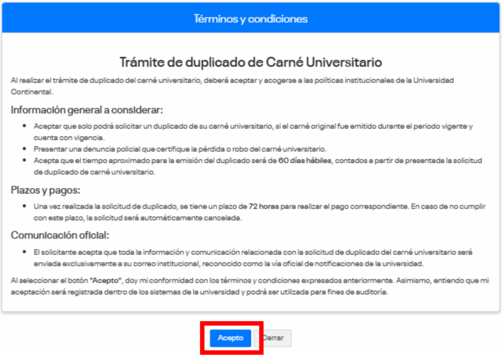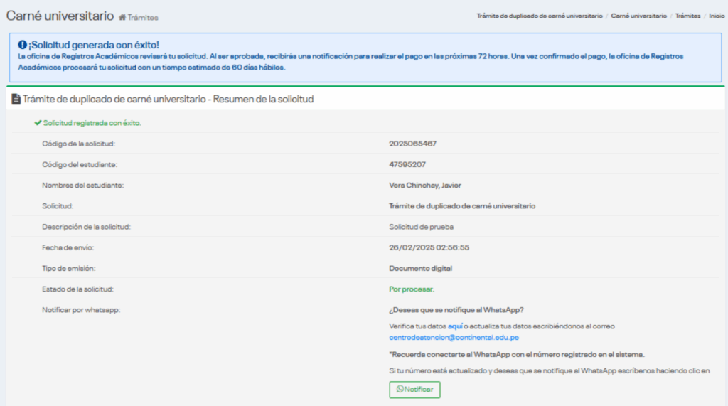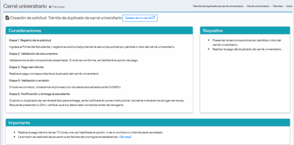 - Una vez realizada la solicitud del duplicado de carné, deberá completar el pago correspondiente en un plazo de 72 horas. De no cumplir con este plazo, la solicitud será cancelada. Recuerda que el trámite del carné universitario se basará en las fechas indicadas en el cronograma interno.