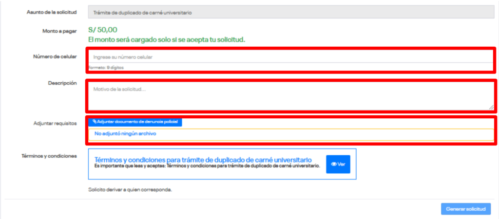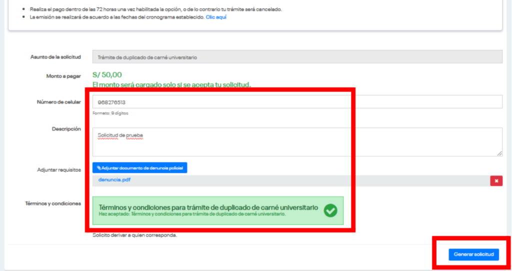 Revisa que la información rellenada sea correcta y haz clic en “Generar solicitud”