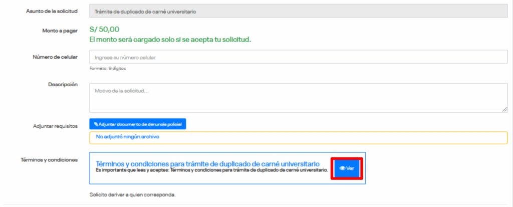 Haz clic en “Ver” para revisar los términos y condiciones. Lee atentamente la información, haz clic en “Aceptar” y podrás continuar con el registro de tu solicitud.