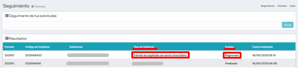 – Selecciona la solicitud que acabas de generar y podrás ver el estado actual de la misma.