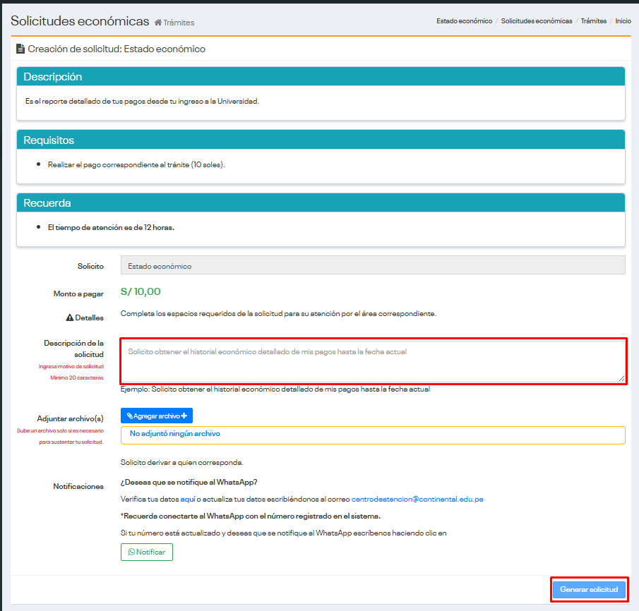 - Genera la solicitud y realiza el pago correspondiente al trámite (S/10.00).