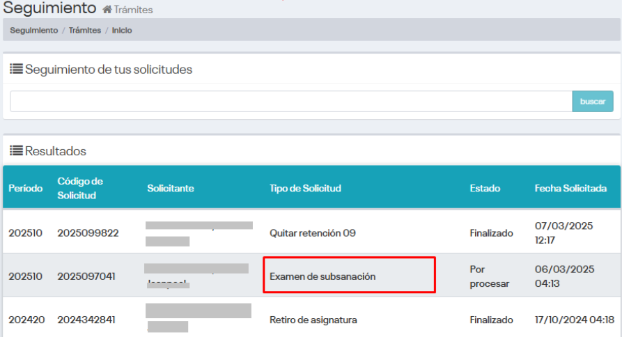Seleccione la opción “Tramites” y selecciona “Examen de Subsanación”
