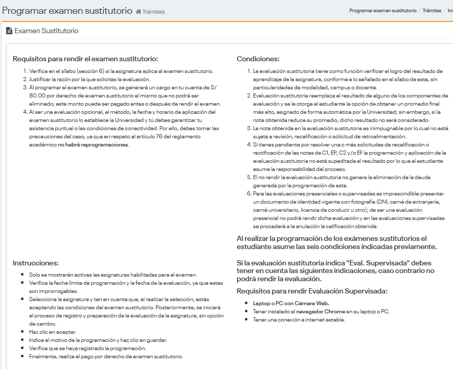 El examen sustitutorio está dirigido a aquellos estudiantes que por alguna razón no pudieron dar alguna evaluación de los consolidados, examen parcial o final o deseen sustituir la nota más baja que obtuvieron.