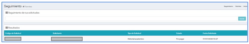 - Podrás realizar el seguimiento de tu solicitud, ingresando a la opción “Trámites”, sección “Seguimiento”. En este espacio visualizarás una lista de las solicitudes tramitadas para su respectivo seguimiento.