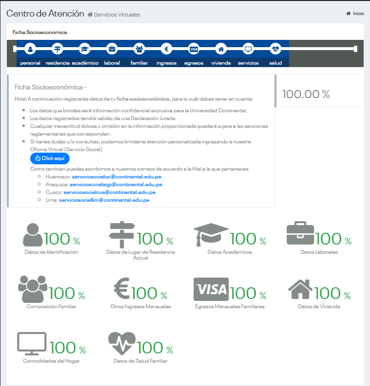Completa al 100 % cada pestaña de la ficha socioeconómica , incluyendo información personal, académica, laboral, familiar, económica y de vivienda.