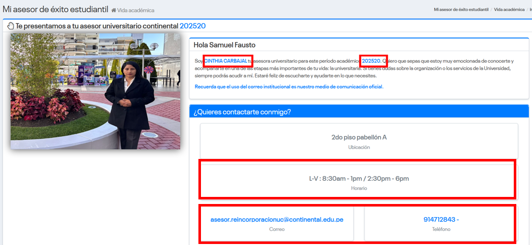 Ingresando a la opción se podrá visualizar la información necesaria para comunicarte con tu asesor estudiantil respectivo como: celular, correo y horario de atención.