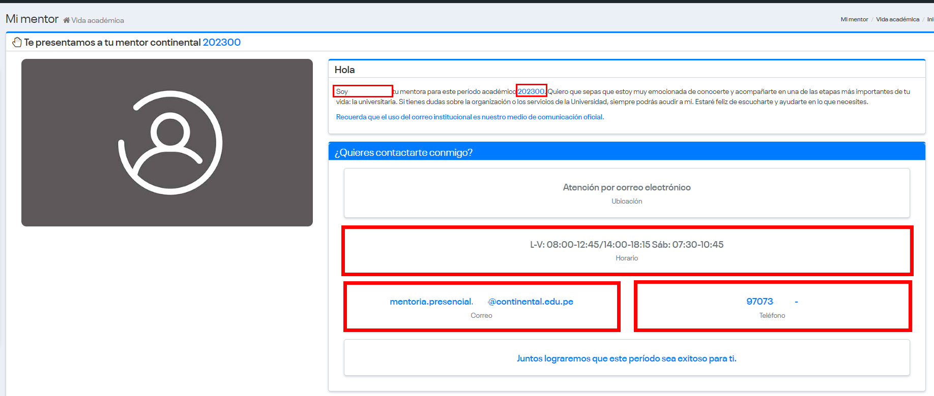 Ingresando a la opción se podrá visualizar la información necesaria para comunicarte con tu asesor estudiantil respectivo como: celular, correo y horario de atención.
