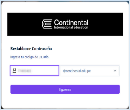 - Ingrese el código de usuario (DNI), seleccione el dominio correspondiente (xxxxxxxx@continental.edu.pe) y, finalmente haga clic en “Siguiente”.