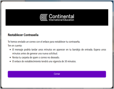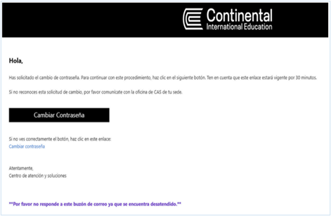 - Ingresa a tu correo personal, ubica el correo de restablecimiento con asunto “Cambio de Contraseña CIE” y haz clic en el botón “Cambiar contraseña”.