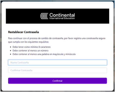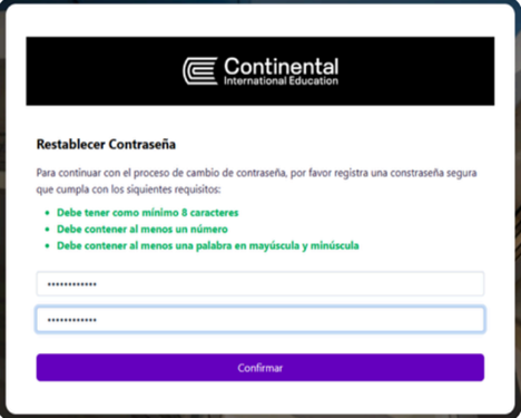 - Si la contraseña cumple con los requisitos listados, éstos se pintarán de verde y podrás hacer clic en “Confirmar”
