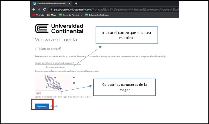 - Ingresa tu correo institucional en el campo requerido, luego coloca los caracteres que te aparecerán de acuerdo con la imagen.