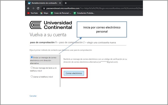 - Realiza la primera comprobación con tu correo personal registrado, luego dale clic a “correo electrónico”.