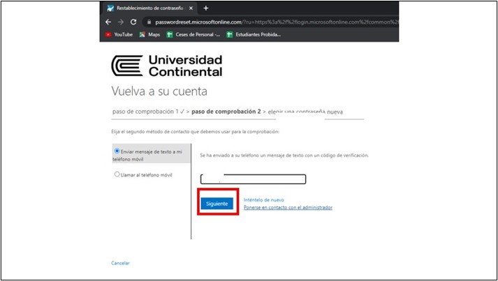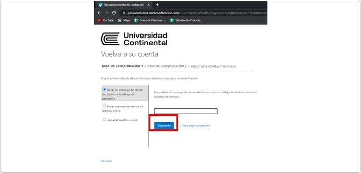 - Registra el código de verificación que llegará a tu correo alternativo y haz clic en “Siguiente”.