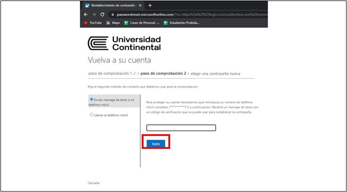 - Se realiza la segunda comprobación verificando tu número de celular registrado. Aquí deberás dar clic en “Texto”.