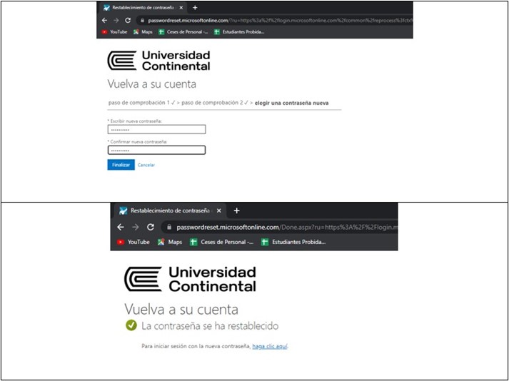 - Ingresa la contraseña nueva, como requisito se debe incluir caracteres especiales, mayúsculas y números para que te permitan finalizar.