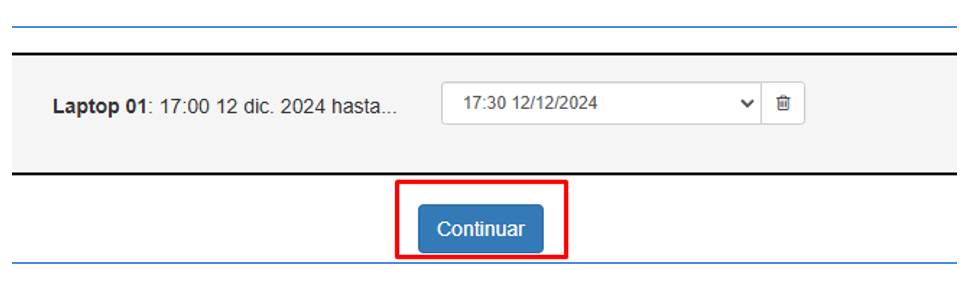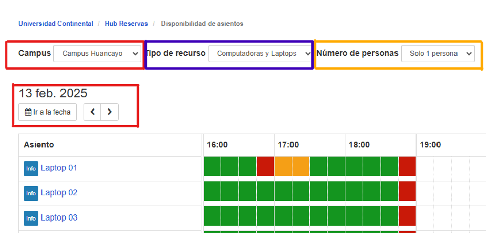 Ejemplo: Si seleccionas el campus Huancayo, solicitando préstamo de una laptop para una sola persona, el día 13 de Febrero a las 5:00 p.m.la información debe visualizarse como la imagen siguiente: