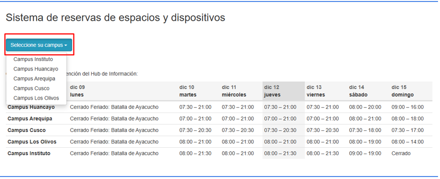 - Te redireccionará a una ventana nueva del Hub de Información, donde podrás seleccionar la sede de tu campus.