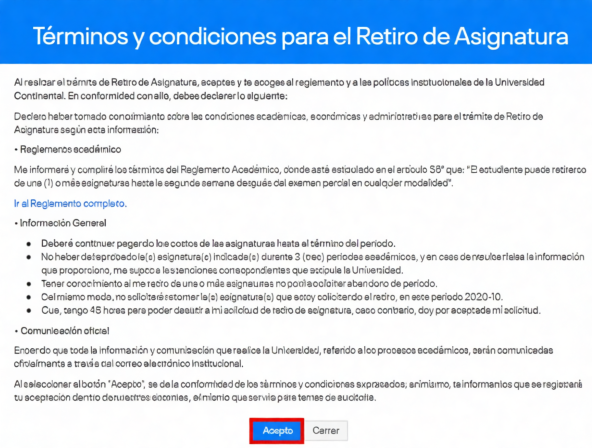 El retiro de asignatura(s) significa que el estudiante matriculado en la Universidad expresa su voluntad de descontinuar sus estudios en una o más asignaturas. El retiro total de las asignaturas en las que el estudiante está matriculado se considerará como retiro del periodo académico. Para el retiro de la(s) asignatura(s), se tendrá en cuenta lo siguiente: