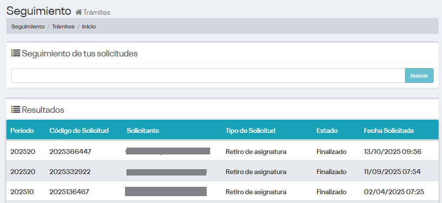 Podrás realizar seguimiento a tu solicitud  ingresando a la opción “Trámites”, sección “Seguimiento”.