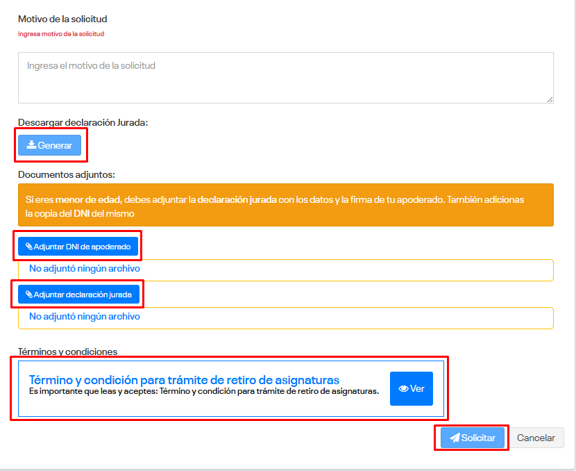 En caso seas menor de edad, deberás adjuntar el DNI de tu apoderado con la declaración jurada, el cual incluirá los datos y firma del mismo (Haz clic en “generar” para obtener el formato).